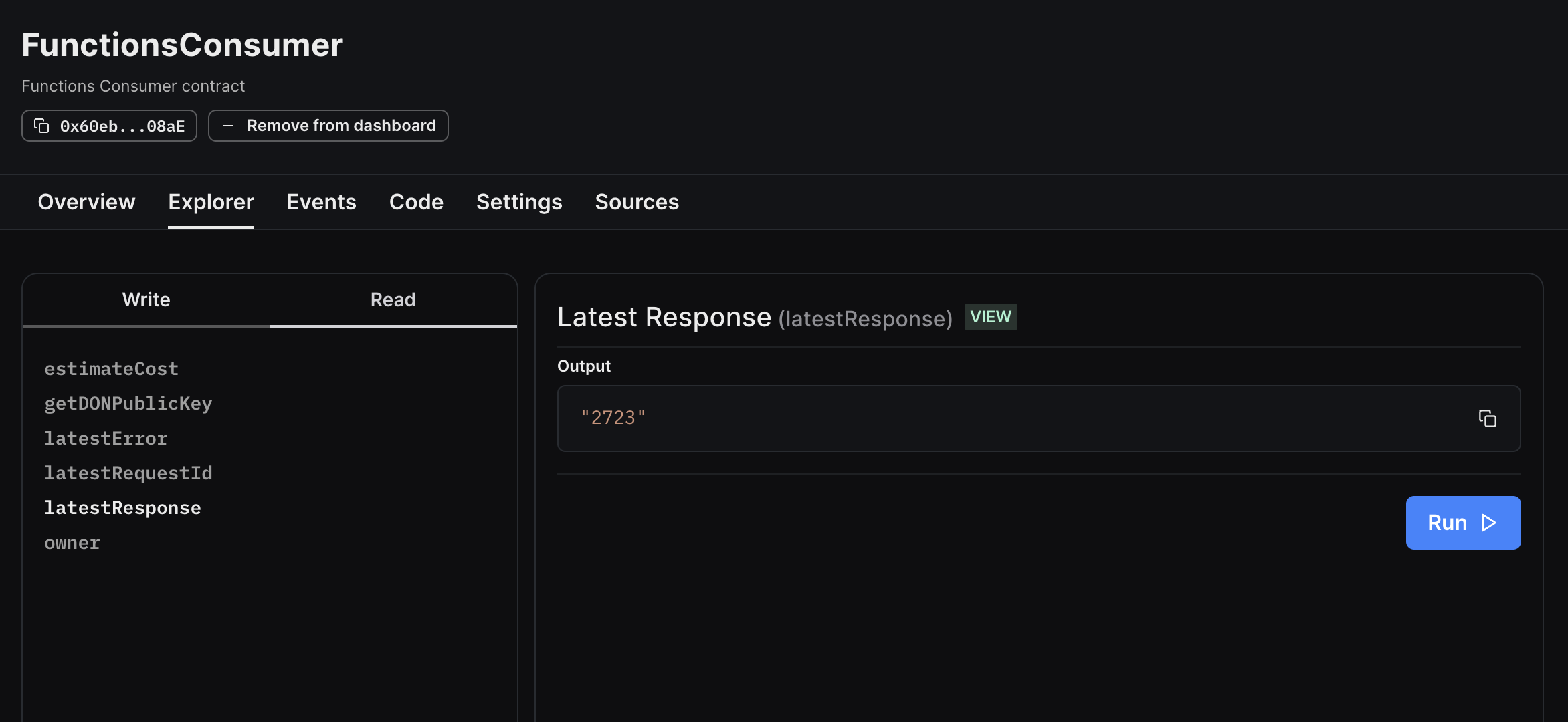 To view the request result, select the lastestResponse read function, allowing you to obtain the new player rating. You can now use this data in your projects and easily build Chainlink Functions into a front-end using our React SDK. For example, you could mint an NFT with the rating as a property in the metadata for use as an in-game asset.