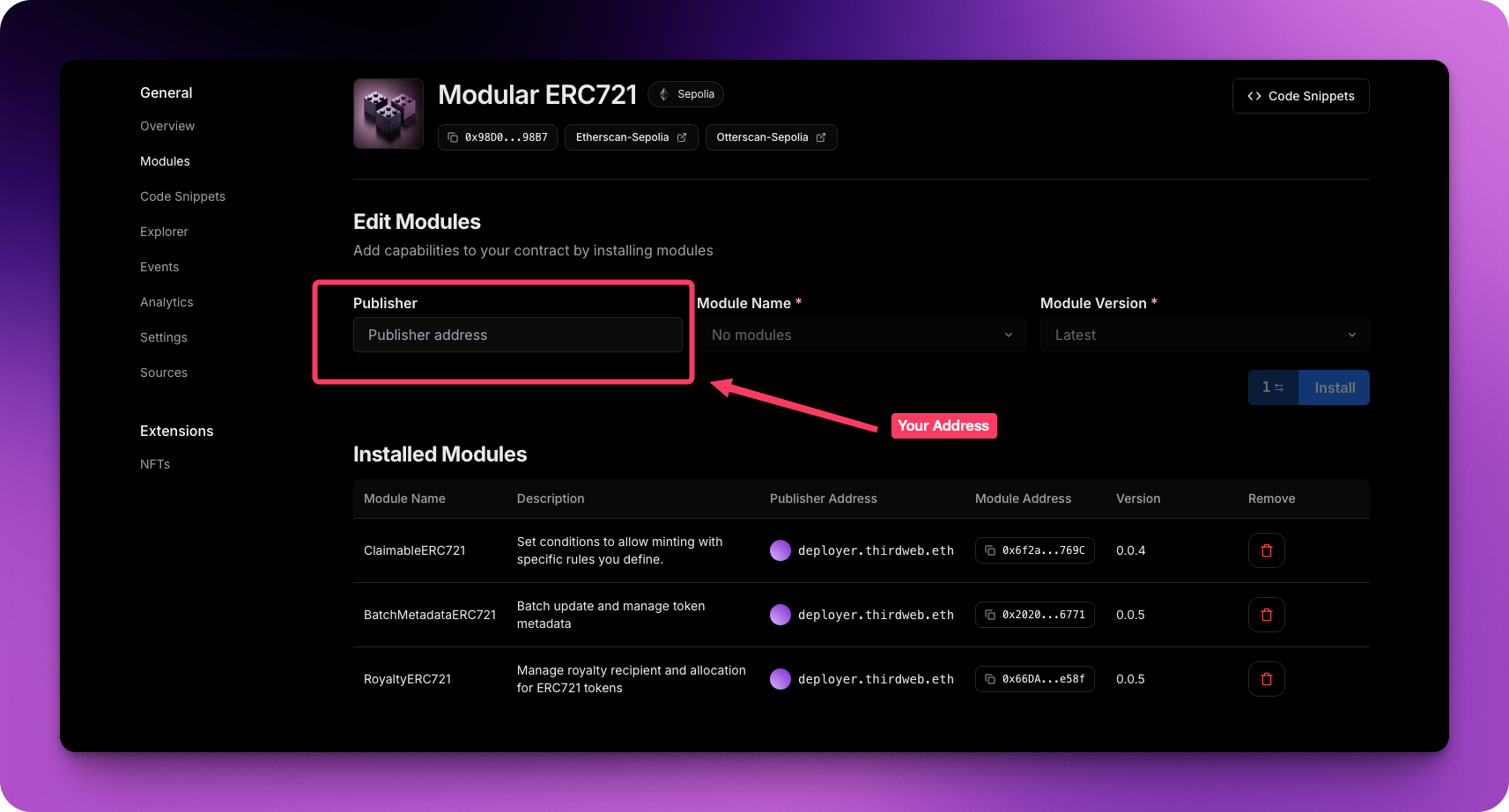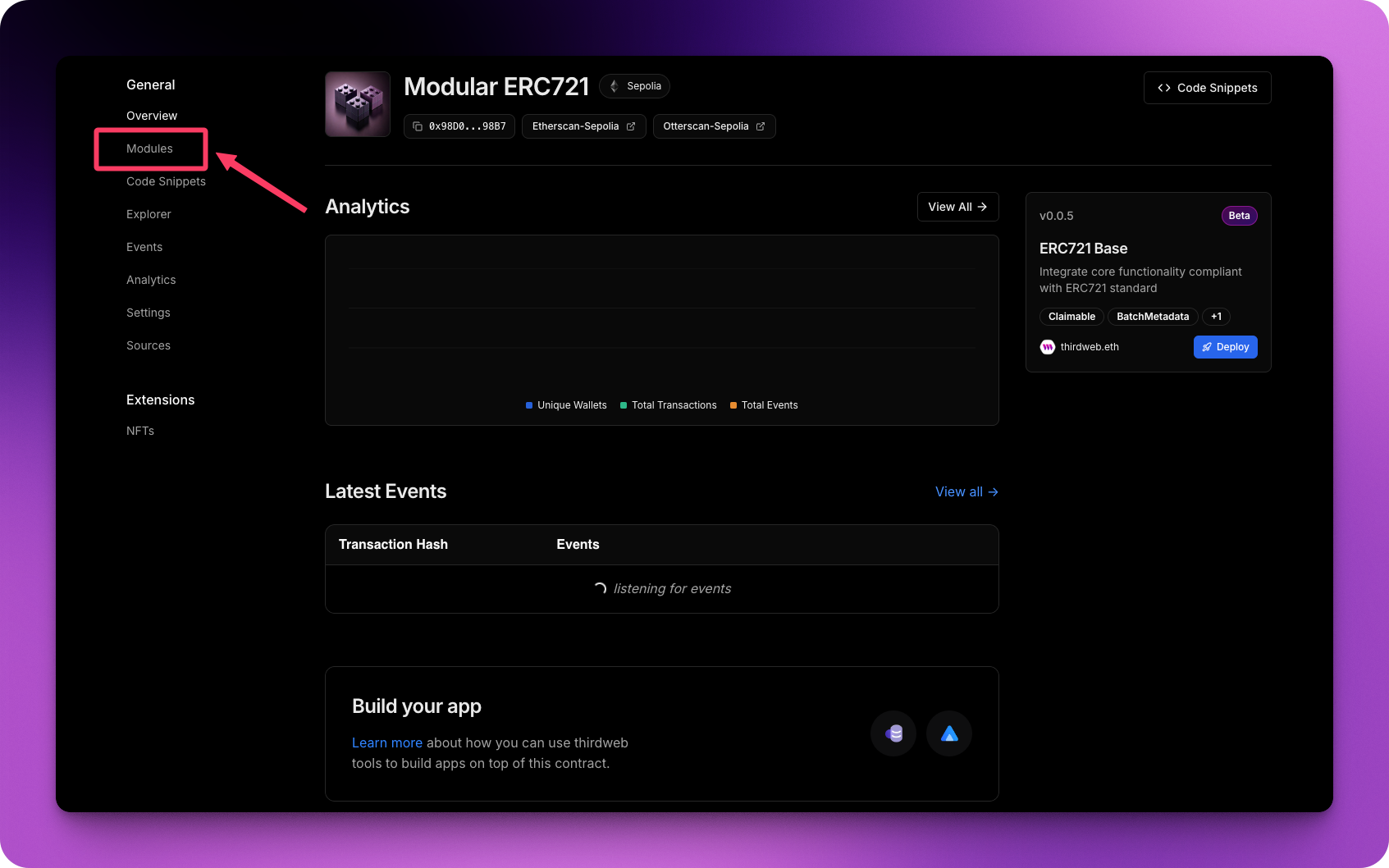 Once deployed, you'll land on the contract dashboard. Here you can view analytics, transactions, and most importantly, manage modules.