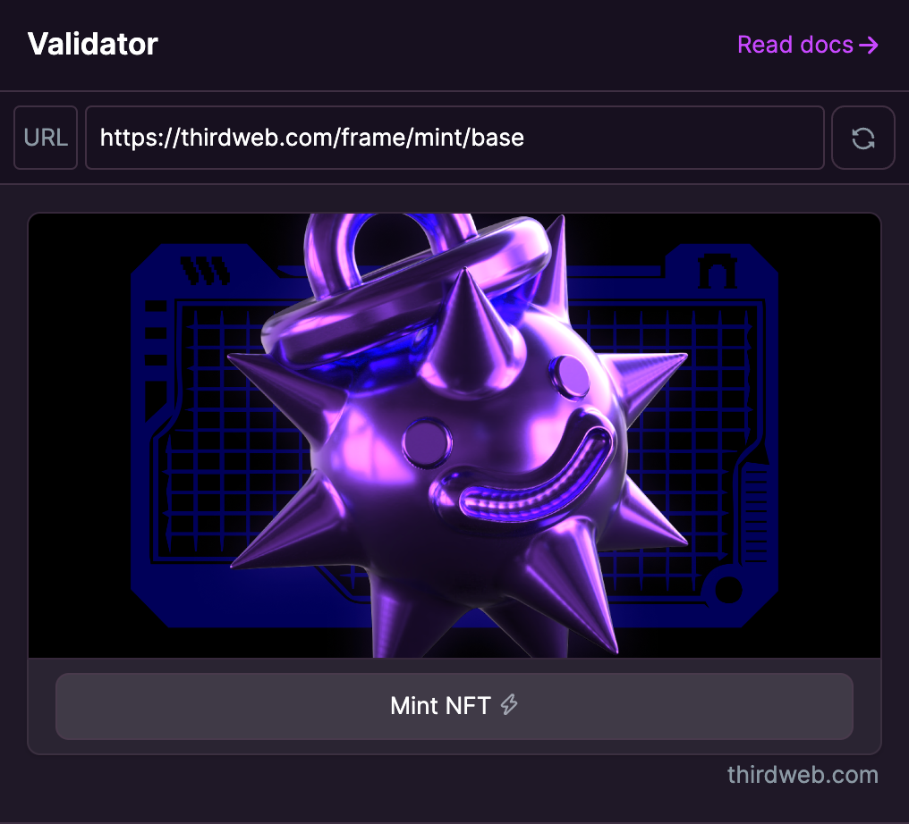Preview our example frame by pasting the following link into the Warpcast Frame Validator: https://thirdweb.com/frame/mint/base