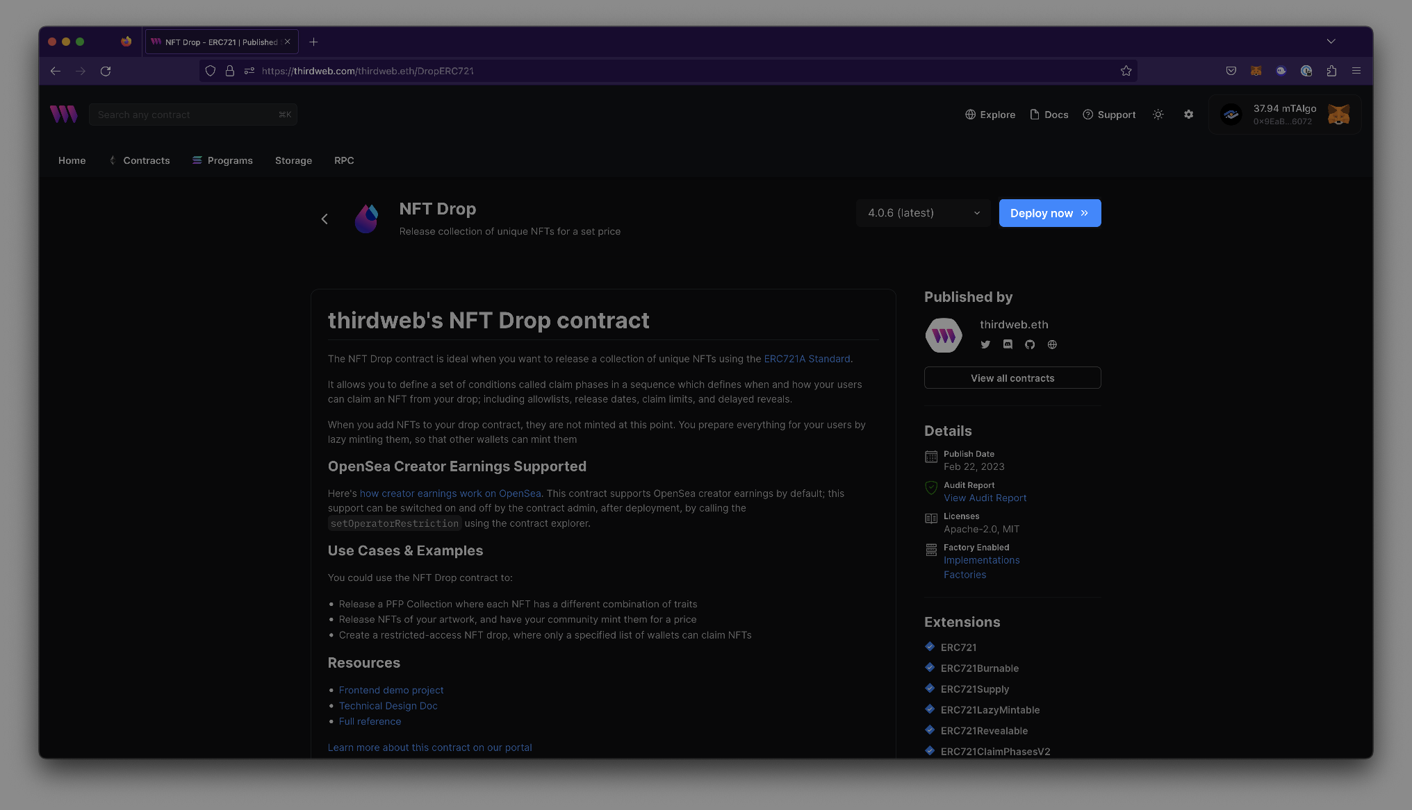 To begin, let's first navigate to the NFT Drop page on Explore by visiting https://thirdweb.com/thirdweb.eth/DropERC721 and connect your wallet.