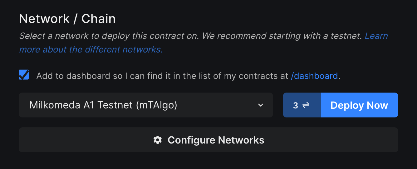 5. Click the blue Deploy Now button next to the dropdown. This will prompt you to confirm transactions in your connected wallet. After, you will be redirected to your project's dashboard.