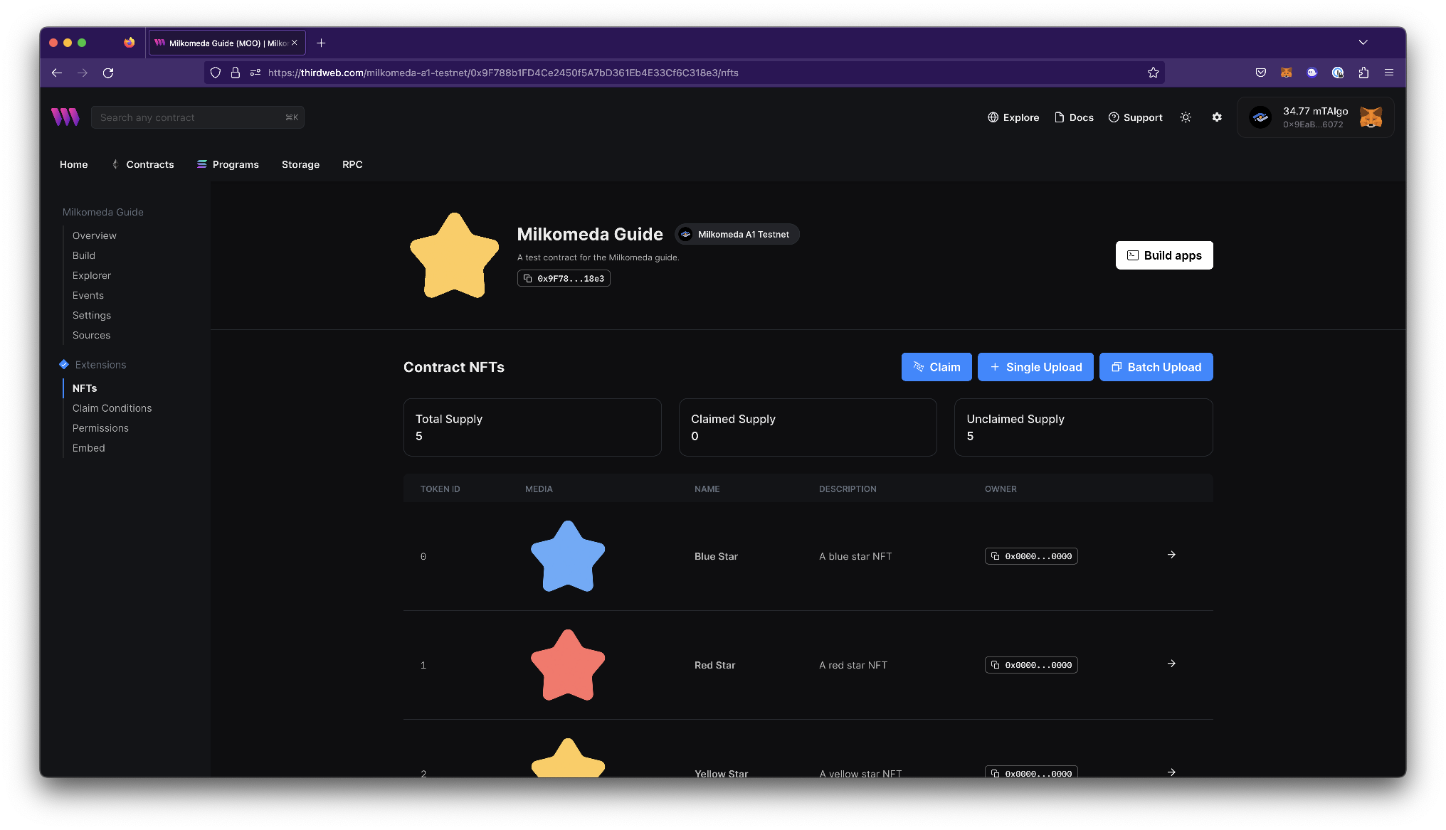 6. Navigate to the NFTs tab under Extensions. Upload your NFTs to the contract by either using Single Upload or Batch Upload. You may configure additional settings here as you upload such as Delayed Reveal.