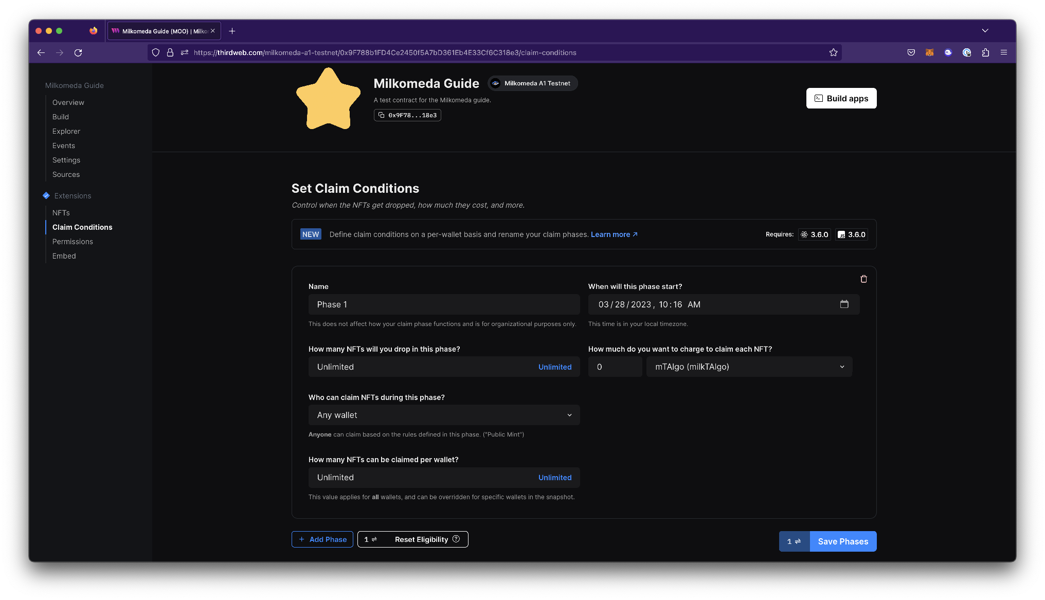 7. Navigate to the claim conditions tab to setup your contract's claim settings. Start a phase by clicking + Add phase and add your preferred settings. When done- click Save Phases which will prompt another transaction.