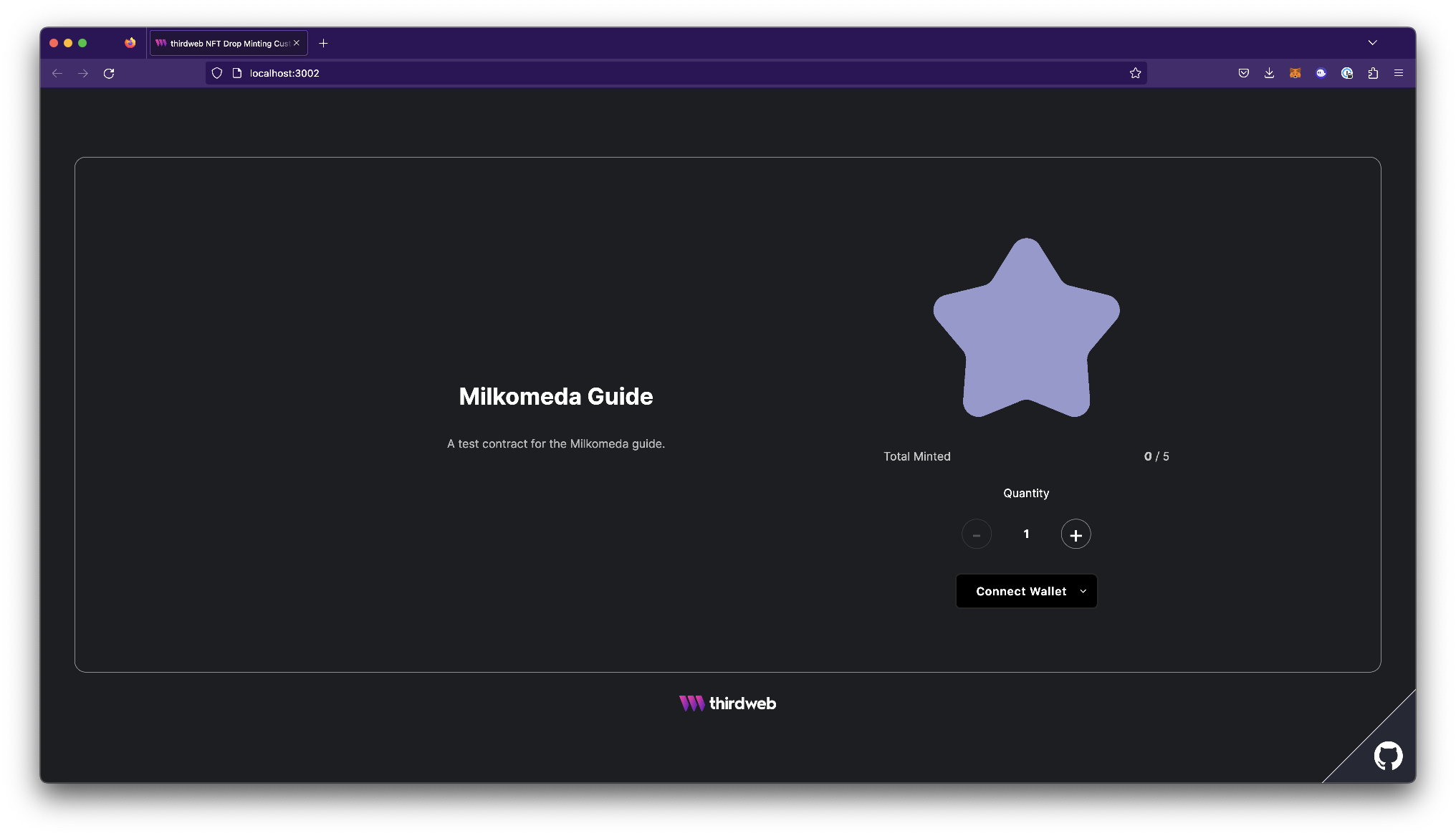 const myNftDropContractAddress = "0x9F788b1FD4Ce2450f5A7bD361Eb4E33Cf6C318e3";"4. Start your program by the corresponding yarn or npm command- depending on which package manager you are using and you should see a Minting Page with your NFT Drop contract.