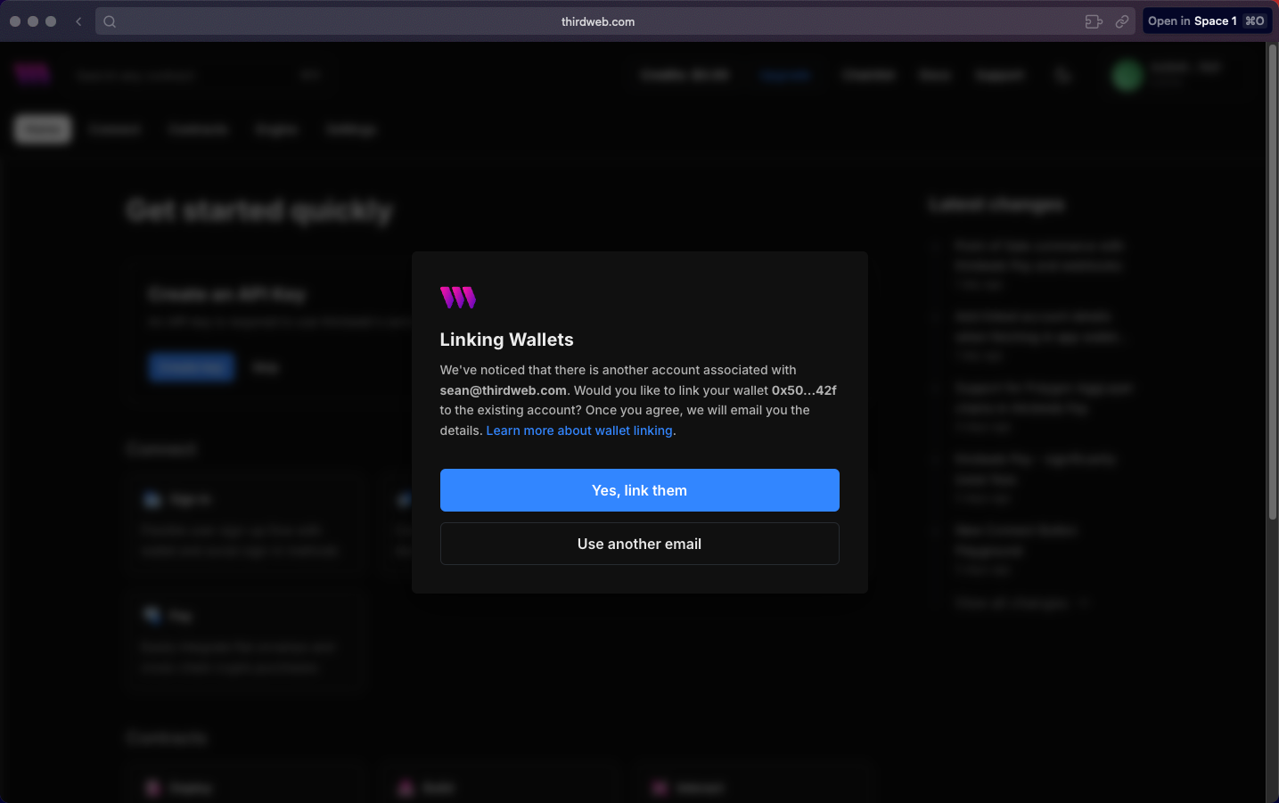 Once switched, the system will prompt you to confirm whether you already have a thirdweb account associated with that wallet. If so, you can proceed to link the accounts.