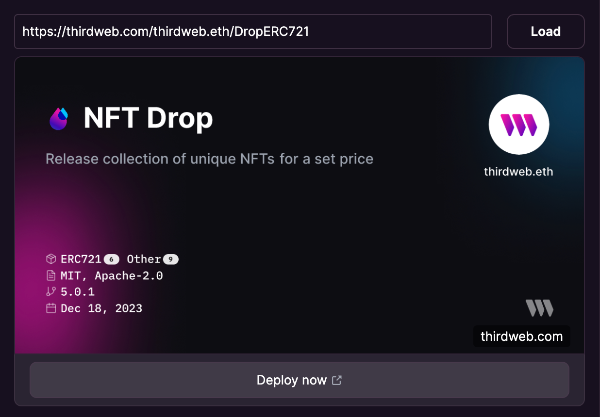 And voilá! Users can now hit the "Deploy now" button in the frame to navigate to your contract's landing page — enabling them to deploy it instantly, with their own custom contract metadata, on any EVM chain.