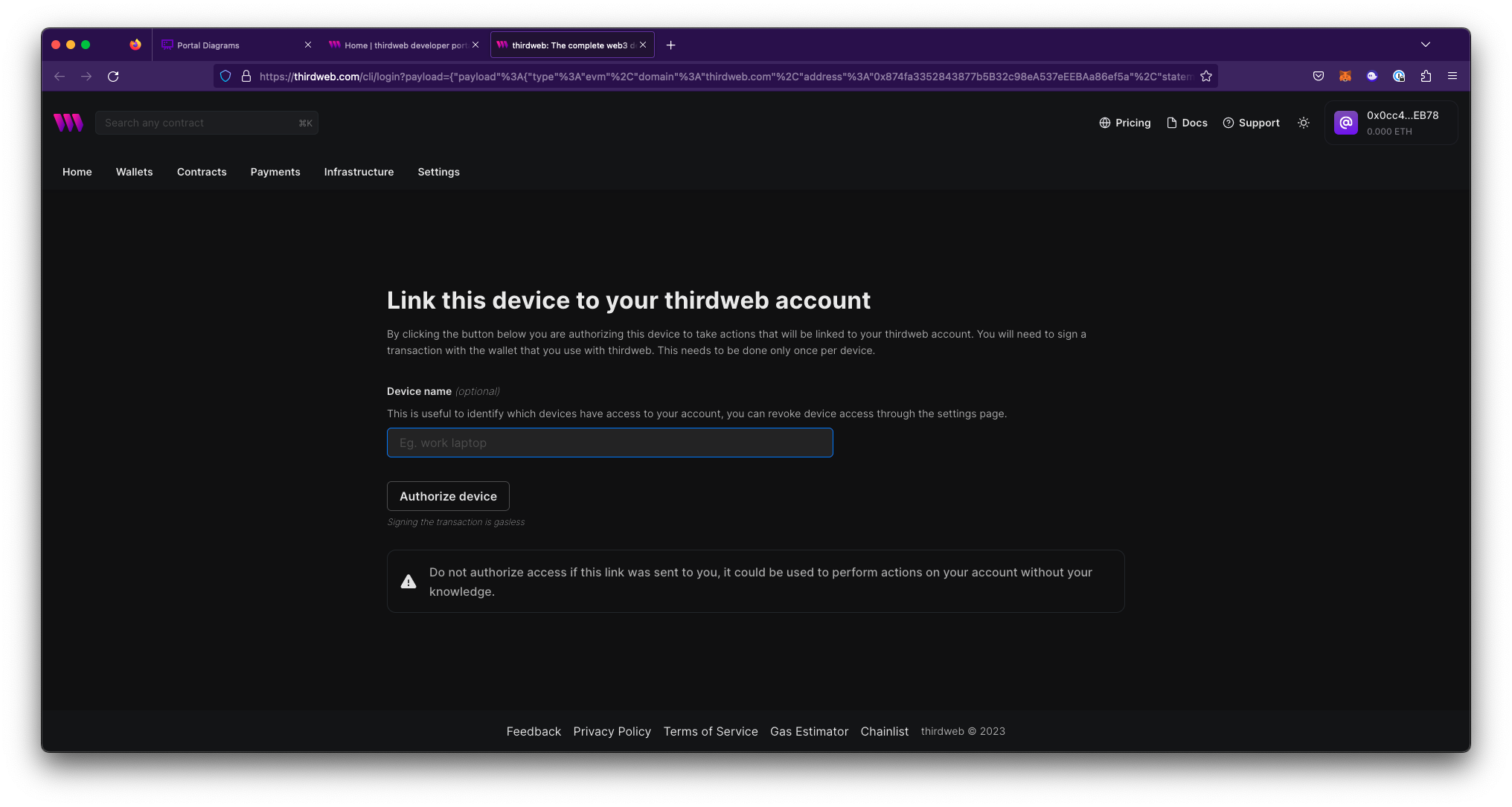 2. To deploy from your desired wallet in your browser, connect and authorize your device.