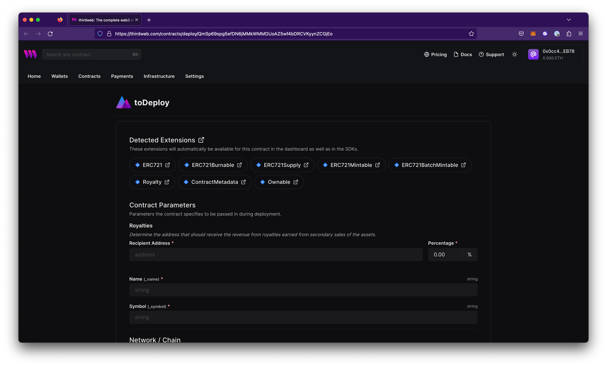 4. Fill in the necessary fields, then find the Network / Chain drop-down menu to select a network for deployment. Choose the Add to dashboard option and click Deploy Now. This will require you to sign a transaction in your connected wallet.
