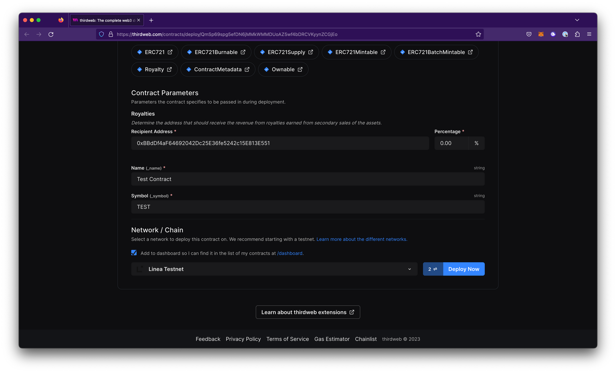 This guide provides a technical walkthrough on how to use thirdweb’s deploy tool with your contract to deploy on the Linea Testnet. The Deploy feature allows you to deploy a smart contract to any EVM blockchain without the need to run scripts or pass private keys into a .env file.