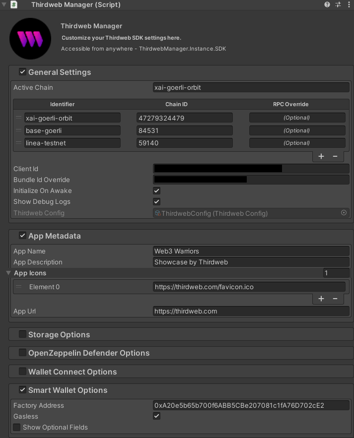 For Web3 Warriors, we opted to use thirdweb's Paymaster infrastructure, which can be integrated simply in our main SDK Prefab - the ThirdwebManager - by simply turning on Gasless under your ThirdwebManager's Smart Wallet settings as shown below: