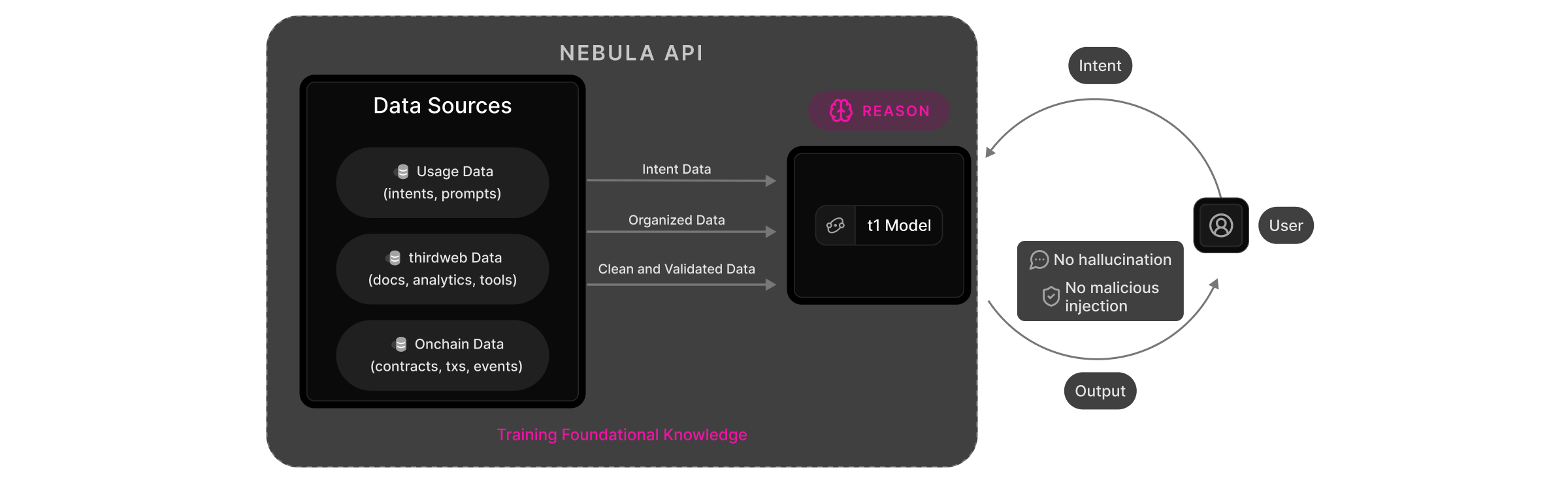 Nebula derives its foundational knowledge from a range of sources, including; existing prompts, thirdweb docs, and variations of onchain data from contracts, transactions & events. The variations of data are organized, cleaned, and validated, which allows thirdweb Nebula to reason and understand web3 primitives.