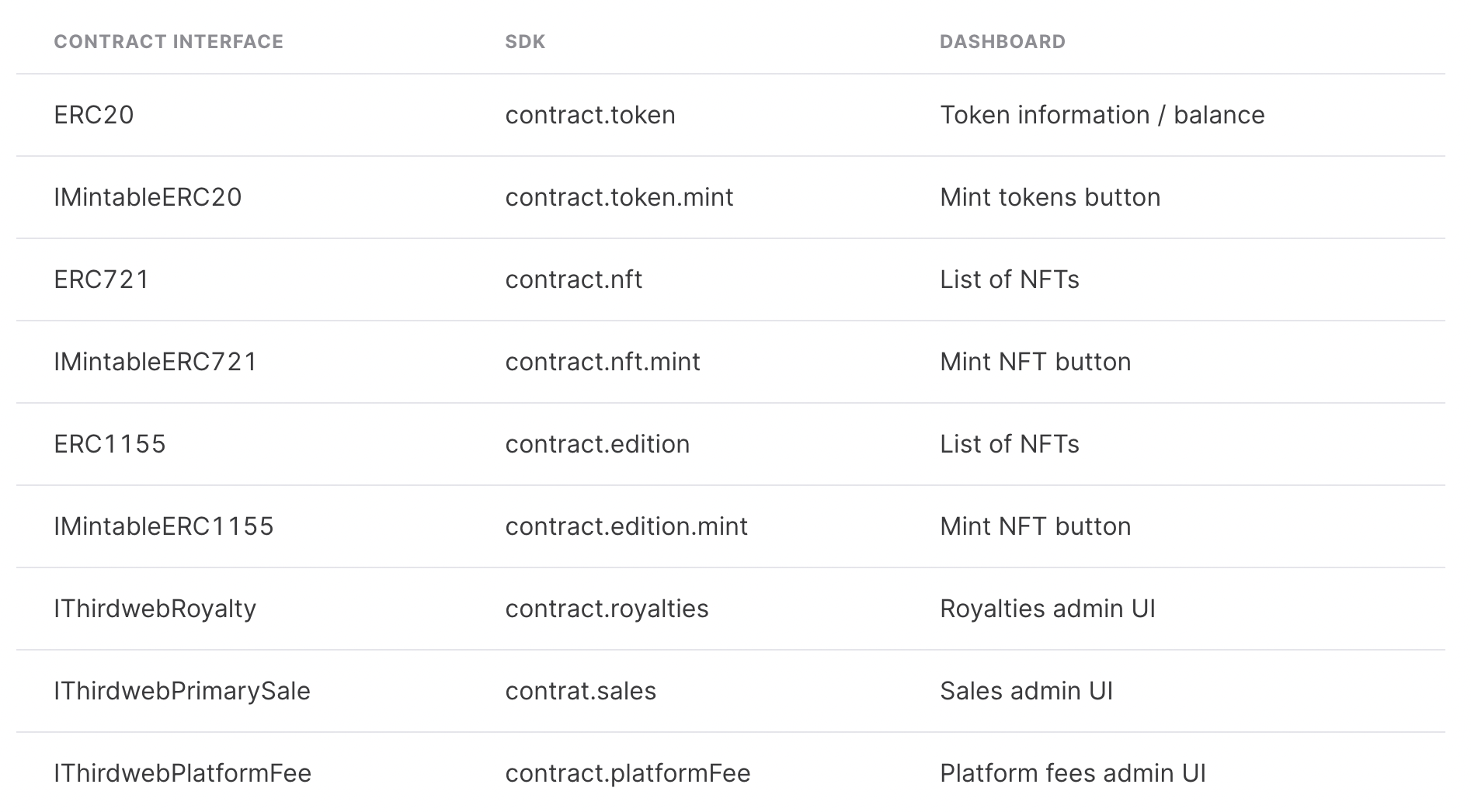 If your contract implements any common EIP specification - like ERC20, ERC721, ERC1155 and more - we auto detect this in the SDK and in our dashboard. This means you get the same intuitive APIs in React, Typescript and Python and convenient web dashboard that you would get with our built-in contracts.