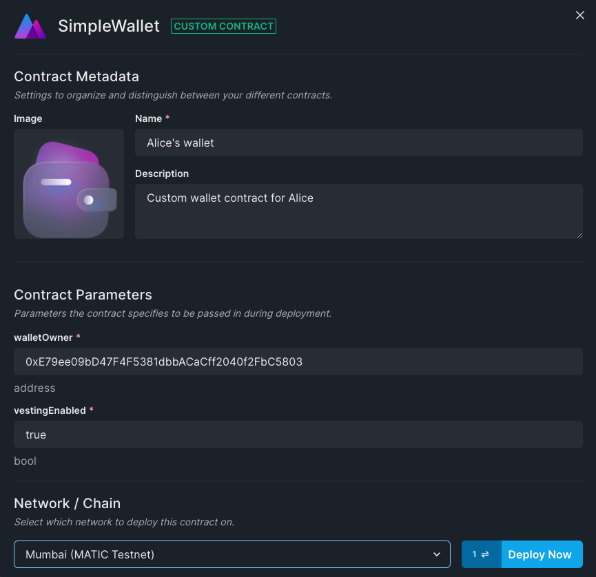 You can deploy a specific instance of the contract directly from your dashboard, specifying basic contract metadata and parameters.