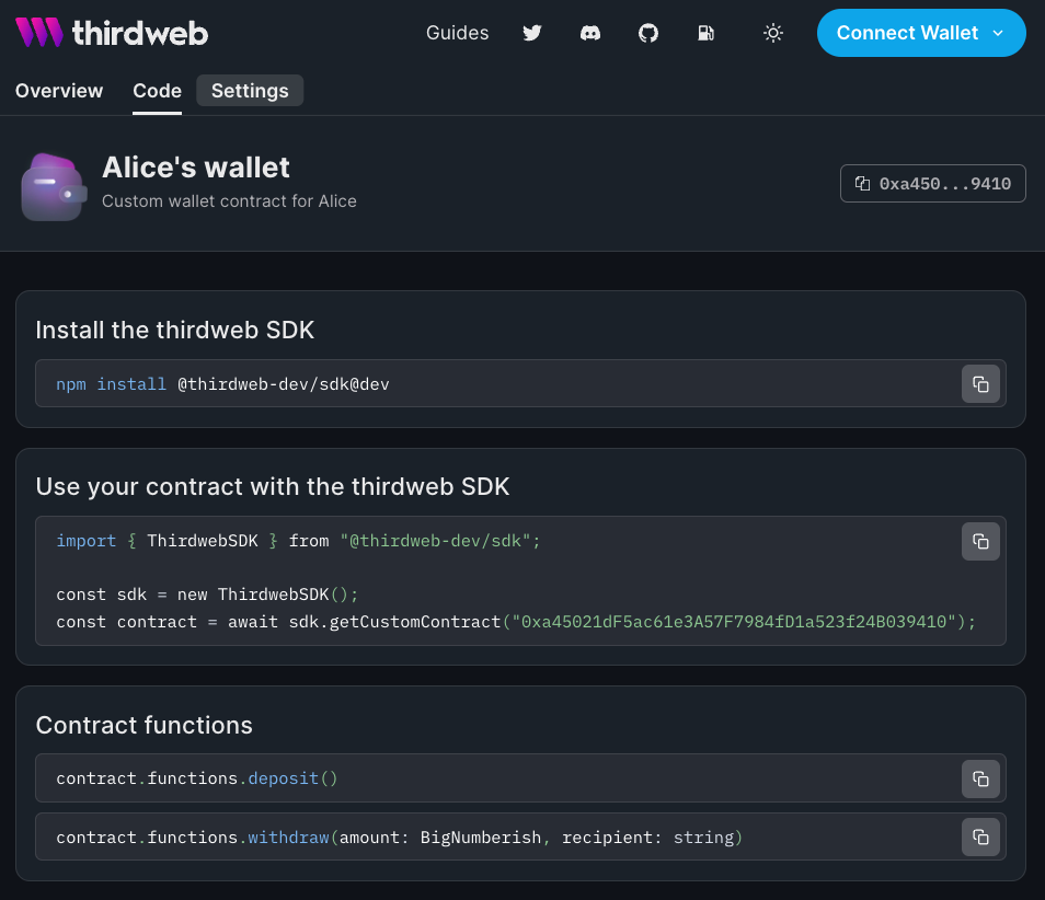 Once deployed, you can immediately start interacting with your deployed contract using automatically thirdweb SDKs! Your contract dashboard will show how to get started and how to call functions on your contract.