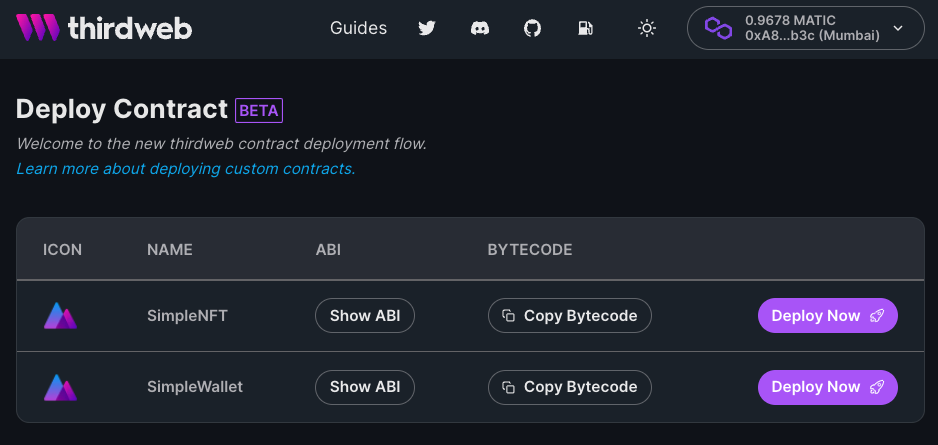You can now deploy your own smart contracts and get all the benefits of the thirdweb platform: SDKs, Dashboards and Analytics for free.