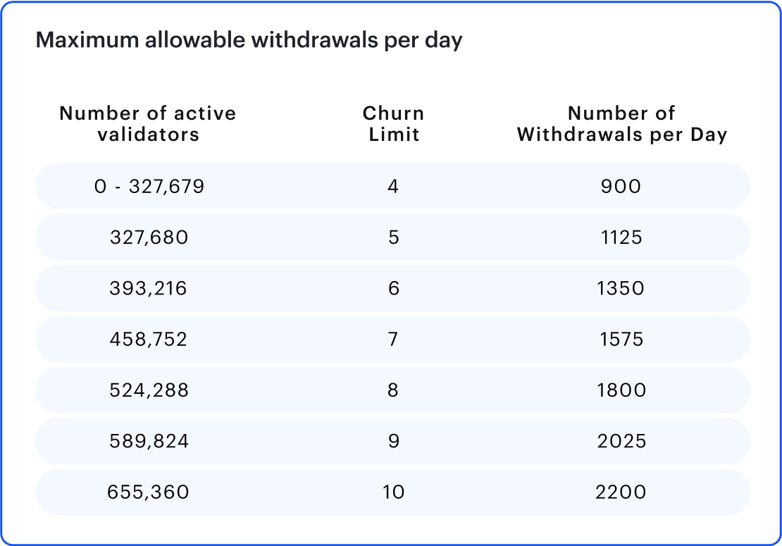 Another aspect of staked ETH withdrawal is the limit on the total number of staked ETH withdrawals per day. It prevents any sudden changes to the chain and deters validators from any illicit activities, as explained here.